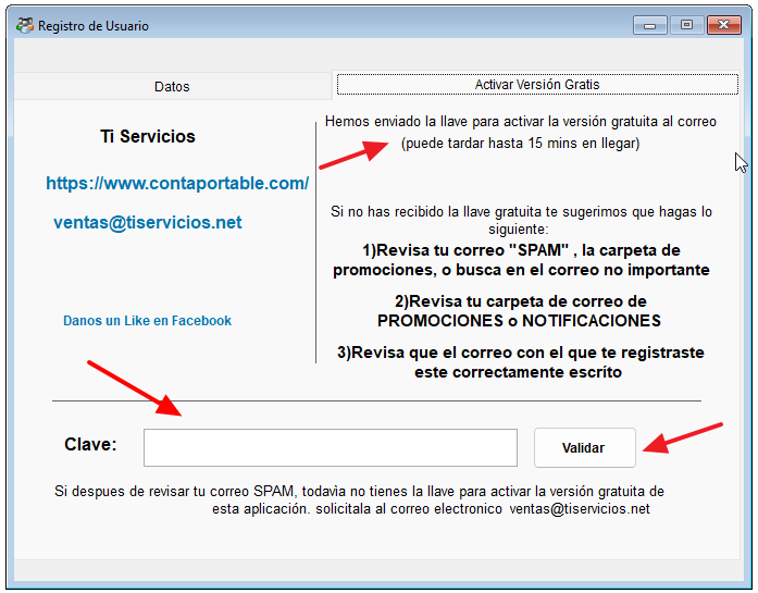 Después de hacer clic en "Registrar usuario", serás dirigido a la vista de activación del software ContaPortable en su versión gratuita. La clave de activación será enviada al correo que ingresaste anteriormente. Introduce esta clave en el campo "Clave" y haz clic en "Validar" para acceder completamente al software ContaPortable. Una vez finalizado este proceso, podrás probar nuestro software sin límite de tiempo.